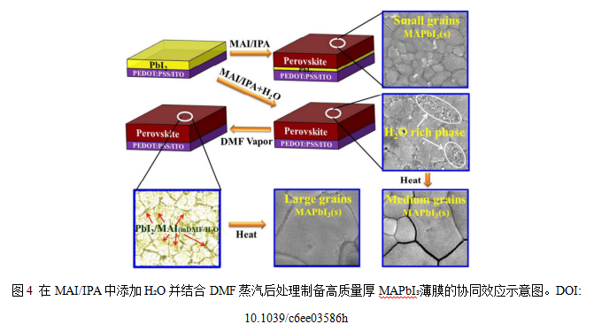 通過(guò)H2O添加劑和DMF氣相處理的協(xié)同作用,制備了高質(zhì)量CH3NH3PbI3鈣鈦礦吸收劑。基于這種高質(zhì)量鈣鈦礦薄膜的倒置(p-i-n)電池實(shí)現(xiàn)了20.1%的高功率轉(zhuǎn)換效率。H2O幫助MAI滲透到厚的PbI2中,形成具有純MAPbI3相的厚膜,并通過(guò)減慢鈣鈦礦結(jié)晶速率產(chǎn)生更大的增益。將這種制備高質(zhì)量、厚鈣鈦礦薄膜的協(xié)同策略擴(kuò)展到制備大面積MAPbI3薄膜(電池和微型組件分別為1.3 cm2和11.25 cm2),實(shí)現(xiàn)了16.7%和15.4%的效率。