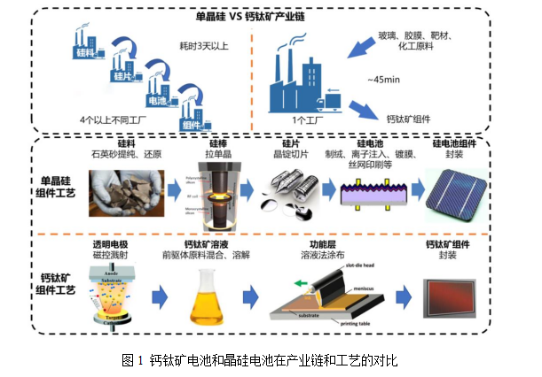 第三代太陽能電池通常指鈣鈦礦太陽能電池(PSCs)、染料敏化太陽能電池(DSSCs)和有機太陽能電池(OPV)等新興的薄膜電池,這類電池是目前光伏領域研究的熱點方向,是未來光伏技術(shù)降本增效的關鍵。作為第三代薄膜太陽能電池的代表,與晶硅電池相比,鈣鈦礦電池有三個方面的優(yōu)勢。(1)更高的理論轉(zhuǎn)換效率(33%)和優(yōu)異的弱光性能。(2)成本低,主要體現(xiàn)在原料來源廣泛、材料用量少、純度要求低、能耗和產(chǎn)線投資成本低。(3)組裝工藝簡單,產(chǎn)業(yè)鏈短,生產(chǎn)高度集中化。