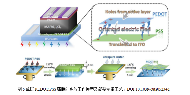 PEDOT:PSS能夠有效地提取和傳輸空穴,在可見光范圍內(nèi)具有較高的透明度,不會顯著影響鈣鈦礦層的光吸收。Li等對PEDOT:PSS薄膜進行水洗處理后,僅留下一層超薄的PEDOT:PSS單層。PSS鏈通過In-O-S化學鍵與ITO表面結(jié)合,PEDOT則通過庫侖相互作用位于PSS之上,形成雙層結(jié)構(gòu)。雙層結(jié)構(gòu)產(chǎn)生從帶正電的PEDOT到帶負電的PSS的定向電場,這加速了空穴的提取過程,提高空穴傳輸效率。PEDOT:PSS的使用會使自身磺酸基團與Pb2+產(chǎn)生配位作用,導致Voc損失較高,限制了器件性能的進一步提升。