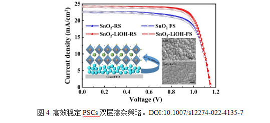 Zhuang等人通過向SnO?膠體分散溶液中直接添加LiOH實現(xiàn)了一種基于離子擴散的雙層摻雜策略。加入LiOH后,部分Li?離子保留在ETL中,對SnO?進行摻雜,而大部分Li?離子則擴散至SnO?/鈣鈦礦界面,并進一步滲透到鈣鈦礦層,從而形成了梯度濃度分布,利于載流子的傳輸,以雙層摻雜策略制備的器件實現(xiàn)了21.31%的光電轉(zhuǎn)換效率。