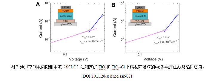 Tan課題組采用非水解溶膠-凝膠法合成了氯封端的TiO?納米晶體,降低了界面處的缺陷態(tài)密度,從而有效減少了界面復(fù)合。制得的小面積鈣鈦礦太陽能電池(0.049 cm2)實現(xiàn)了20.1 %的光電轉(zhuǎn)換效率。