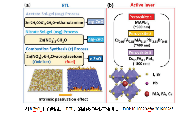 Zheng等人開發(fā)了一種基于燃燒法的合成工藝,成功制備出低溫溶液的ZnO薄膜。利用燃燒合成實現(xiàn)低溫溶液處理的ZnO ETL用于PSCs,由于其固有的鈍化效應(yīng)、高結(jié)晶度、匹配的能級、理想的表面以及與鈣鈦礦層良好的化學(xué)相容性,這種燃燒衍生的鋅使三種鈣鈦礦材料系統(tǒng)中的PCE接近17~20%。