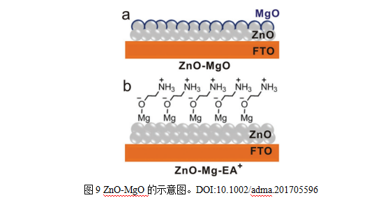 通過界面工程手段對ZnO層進行功能化處理,達到優(yōu)化電荷轉(zhuǎn)移動力學(xué)的目的。其中表面鈍化技術(shù)的應(yīng)用顯著減少了界面缺陷,使鈣鈦礦器件的穩(wěn)定性得到明顯提升。Cao等人使用氧化鎂(MgO)與質(zhì)子化乙醇胺結(jié)合的方式來修飾ZnO層。有效抑制了界面電荷復(fù)合過程,優(yōu)化了鈣鈦礦層向ZnO的電子傳輸路徑,最終制備的電池器件實現(xiàn)了21.1 %的PCE且無遲滯現(xiàn)象。