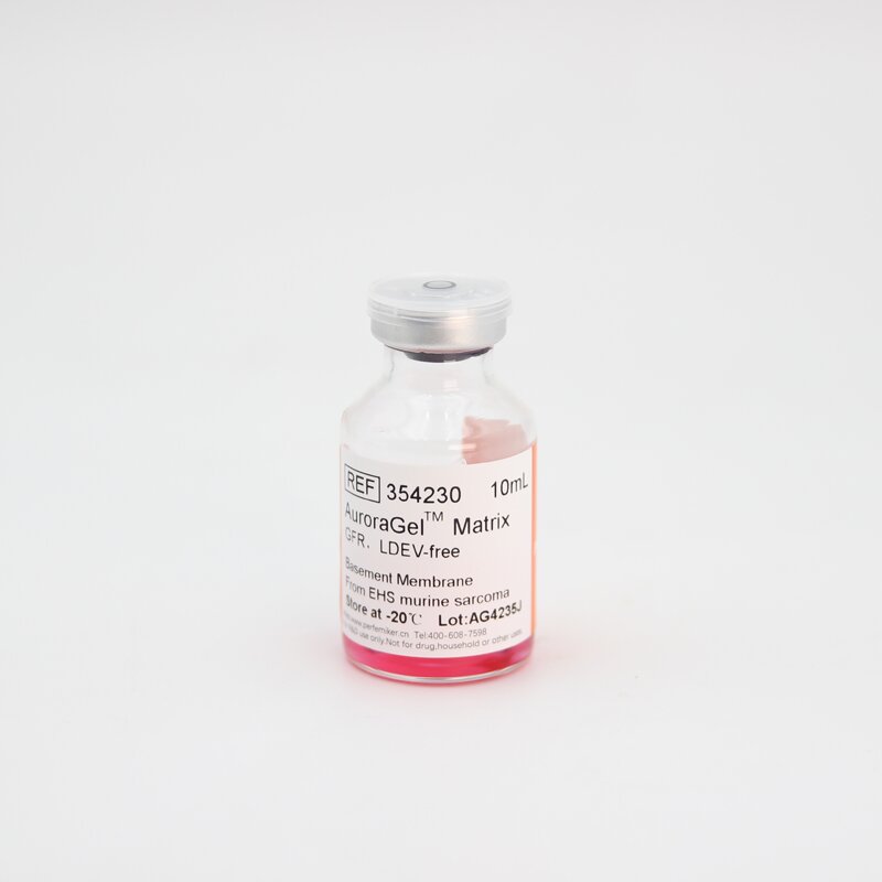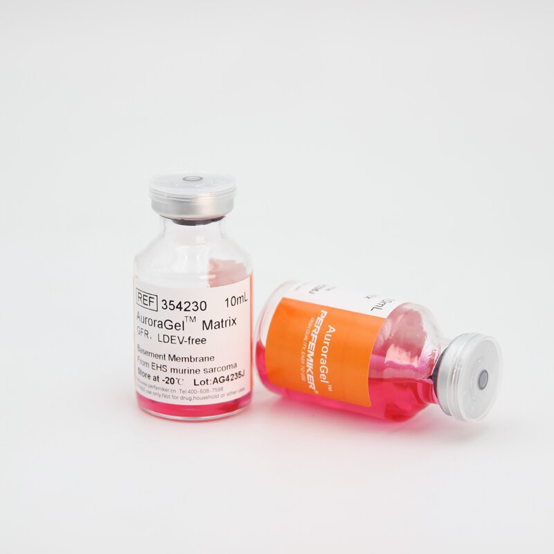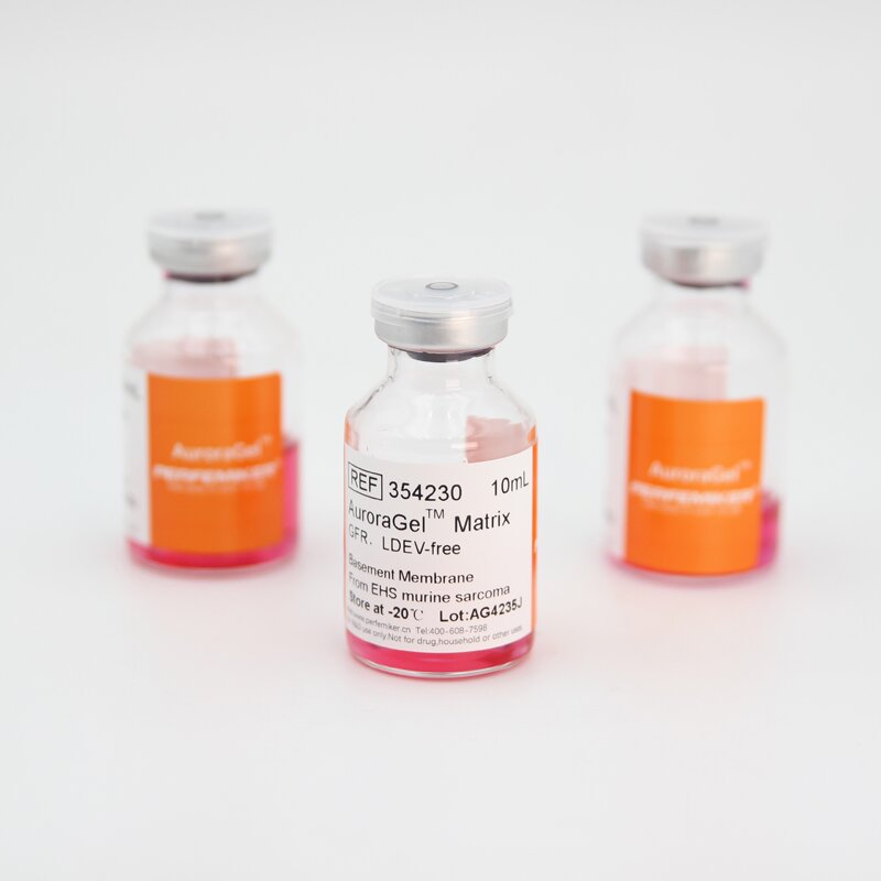 PERFEMIKER® AuroraGelTM Matrix GFR是從富含胞外基質(zhì)蛋白的小鼠腫瘤中提取出的天然基底膜基質(zhì)。主要依次為層粘連蛋白(Laminin)、IV型膠原蛋白(Col-IV)、巢蛋白(Entactin)、硫酸乙酰肝素蛋白多糖(Heparan sulphate proteoglycans)及多種細胞因子,如類胰島素生長因子(IGF-1)、轉(zhuǎn)化生長因子β(TGF-β)、血管內(nèi)皮生長因子(VEGF)、表皮生長因子(EGF)、成纖維細胞生長因子(bFGF)等。產(chǎn)品溶解于高糖含酚紅DMEM中,且非定制產(chǎn)品均添加了50μg/mL慶大霉素。在室溫條件下,聚合形成具有生物學(xué)活性的三維基質(zhì),模擬體內(nèi)細胞基底膜的結(jié)構(gòu)、組成、物理特性和功能,有利于體外細胞的培養(yǎng)和分化。適用于需要減少生長因子誘導(dǎo)的背景信號,對基底膜制備要求較高的研究應(yīng)用。